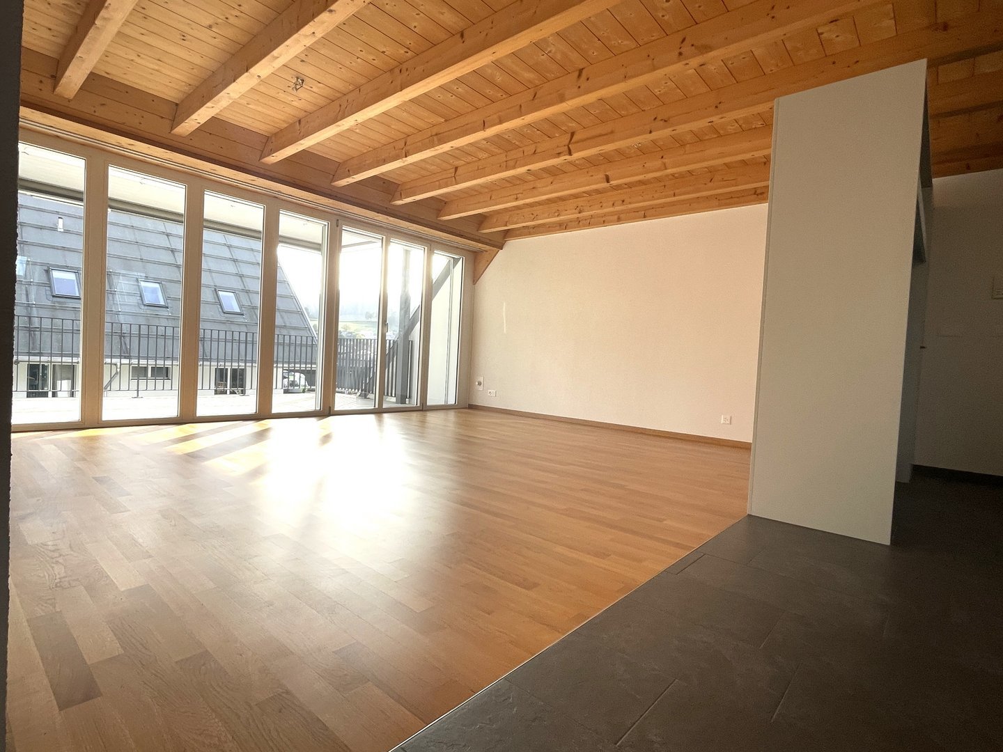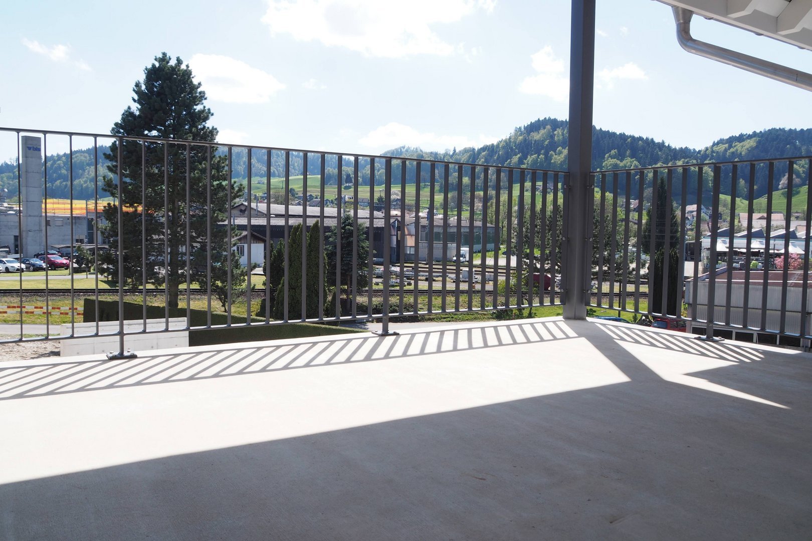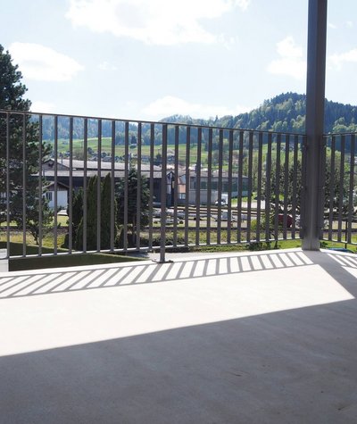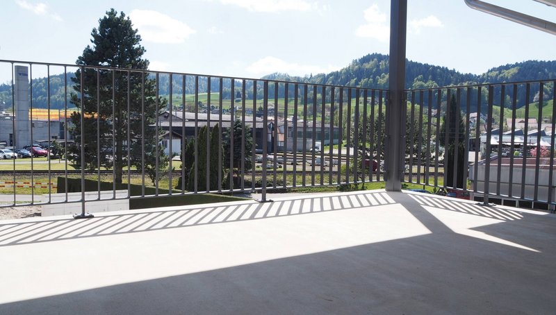 Der grosse Balkon mit Staketengeländer erweitert den Wohnraum nach draussen und bietet Raum für entspannte Stunden im Freien.