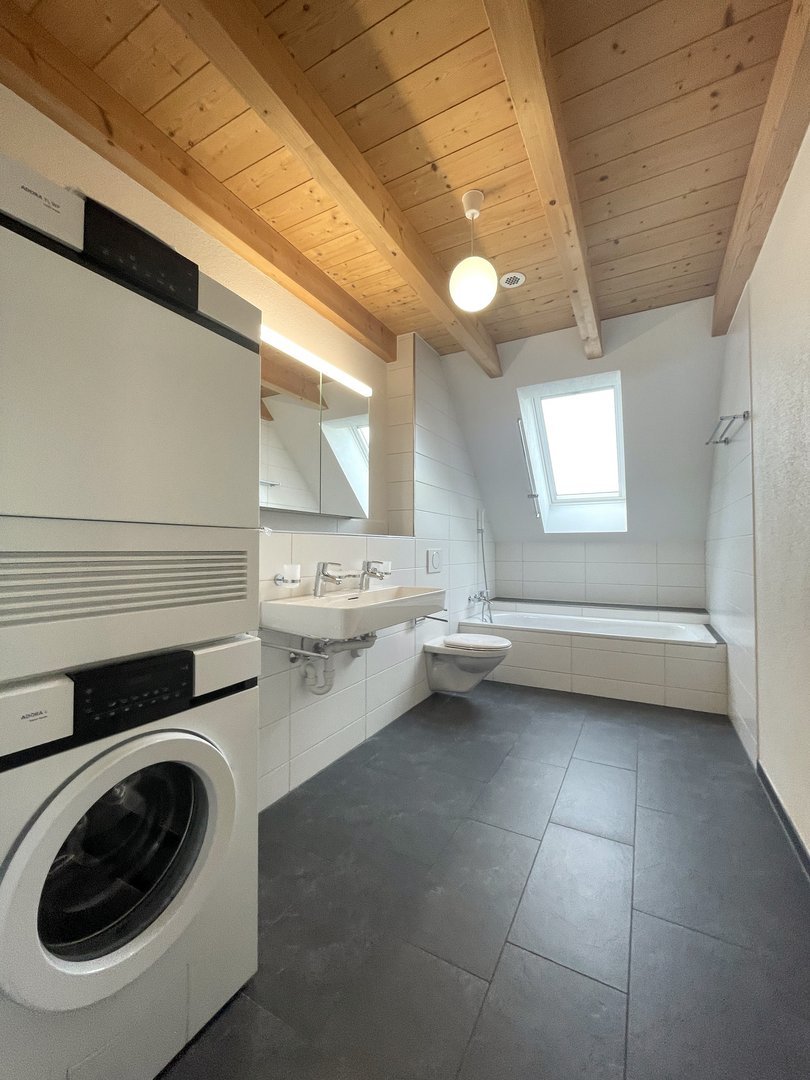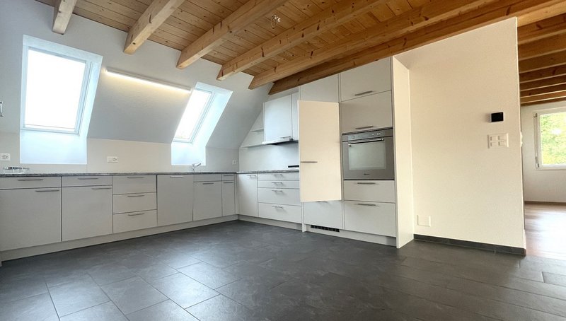 Der offene Wohn-, Ess- und Küchenbereich bildet das Zentrum der Wohnung. Die Küche ist mit hochwertigen Bauknecht-Geräten und einer Steinabdeckung ausgestattet; ein Wasch-Trockenturm von V-Zug ergänzt die Ausstattung. In Küche und Nasszellen wurde pflegeleichter Plattenboden, im Wohnbereich und in den Zimmern edler Holzparkett verlegt.