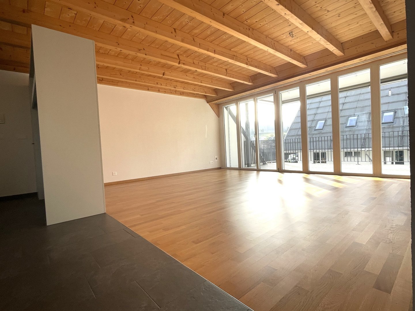 Der grosse Balkon mit Staketengeländer erweitert den Wohnraum nach draussen und bietet Raum für entspannte Stunden im Freien.