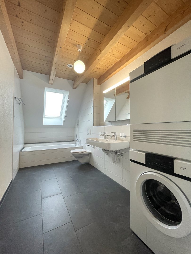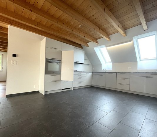 Der offene Wohn-, Ess- und Küchenbereich bildet das Zentrum der Wohnung. Die Küche ist mit hochwertigen Bauknecht-Geräten und einer Steinabdeckung ausgestattet; ein Wasch-Trockenturm von V-Zug ergänzt die Ausstattung. In Küche und Nasszellen wurde pflegeleichter Plattenboden, im Wohnbereich und in den Zimmern edler Holzparkett verlegt.